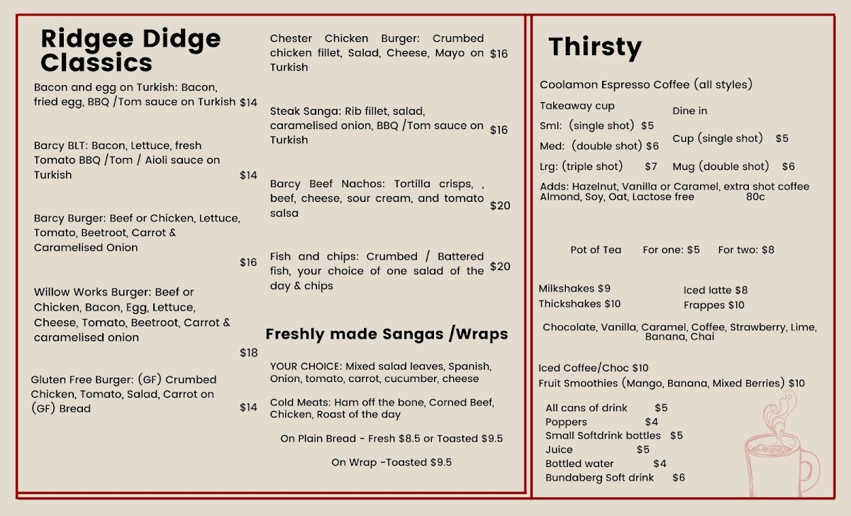 The culinary gems on the menu further highlight Ridgee Didge’s commitment to quality and flavor. Begin your day with the highly acclaimed Barcy Big Brekkie for A$26.00, a hearty feast that promises to satiate even the most robust appetite. Alternatively, the Bacon and Egg on Turkish for A$14.00 is a simple yet satisfying choice that embodies comfort and taste. Craving something classic? The Barcy Burger (A$16.00) and Fish and Chips (A$20.00) are adored by returning customers, who appreciate the balance of flavors and generous portions.